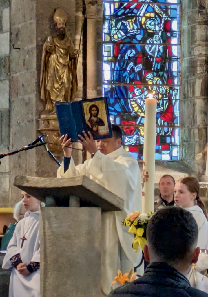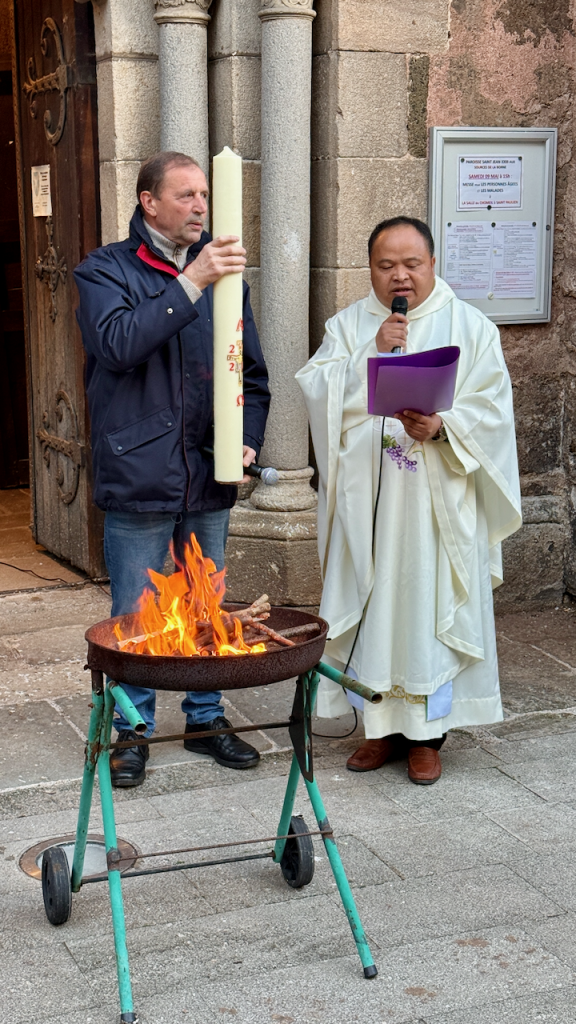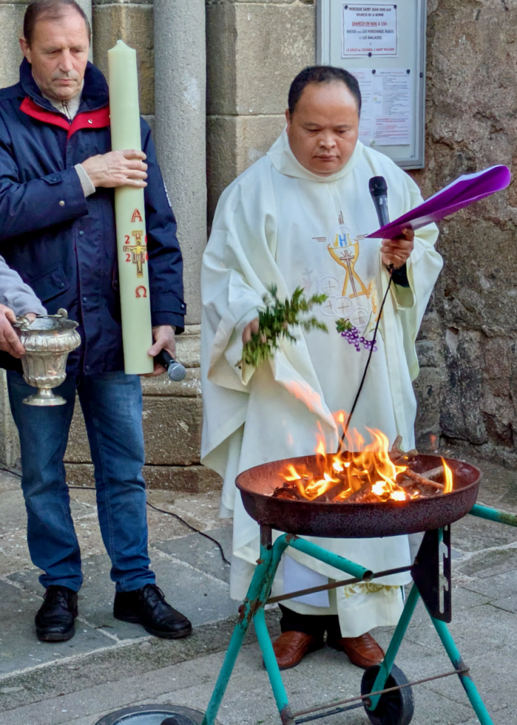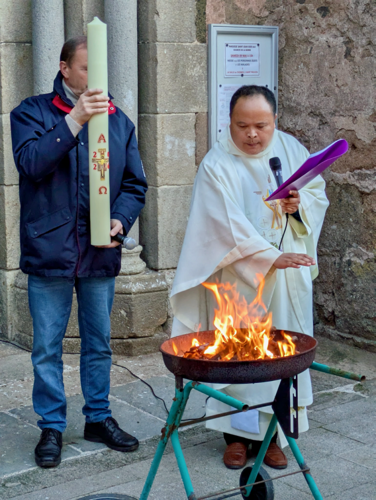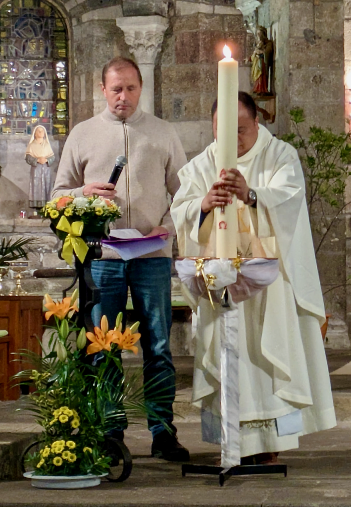 Qu'il est bon, la nuit, de croire à la lumière ! Qu'il est bon de chanter la victoire du Seigneur ) Nous sommes des chrétiens du jour, et rassemblés ce soir pour le crier au monde. Le Christ triomphe à jamais du mal et de la mort. Le Père l''a relevé. Nous avons quitter nos robes de pénitence et de désespoir, nous nous sommes habillés de lumière et de joie.Christ est réssuscité ! Alléluia !