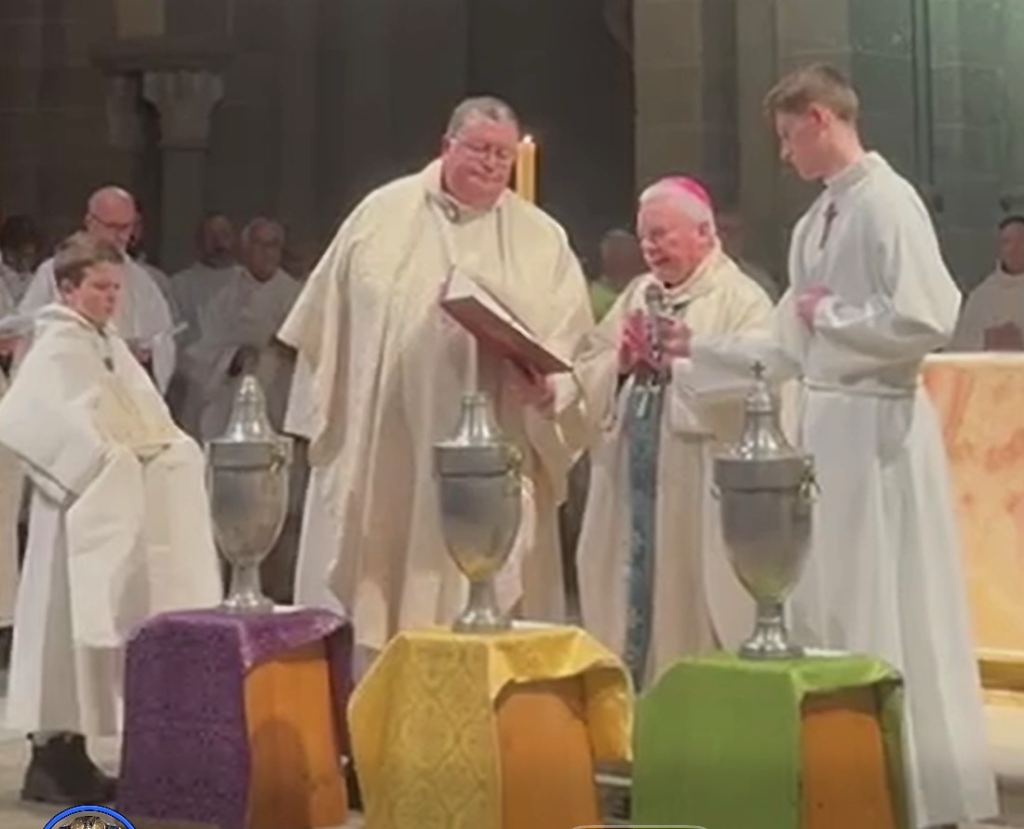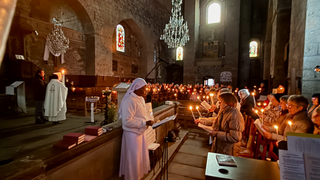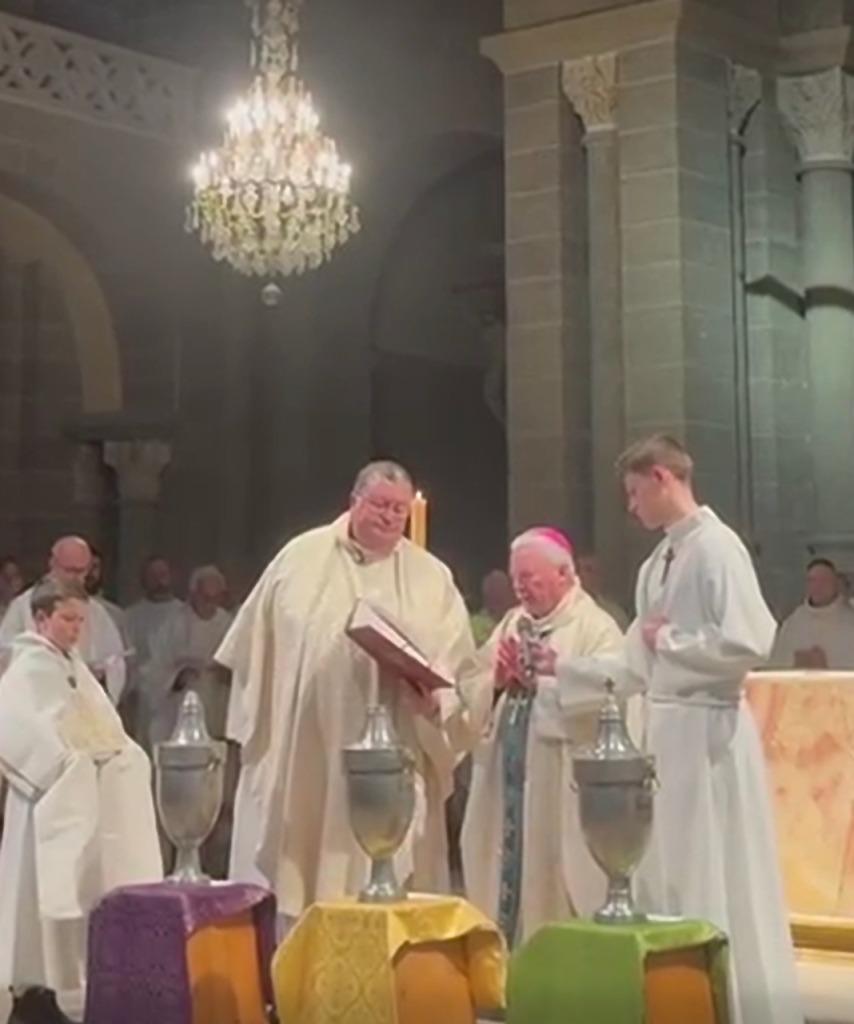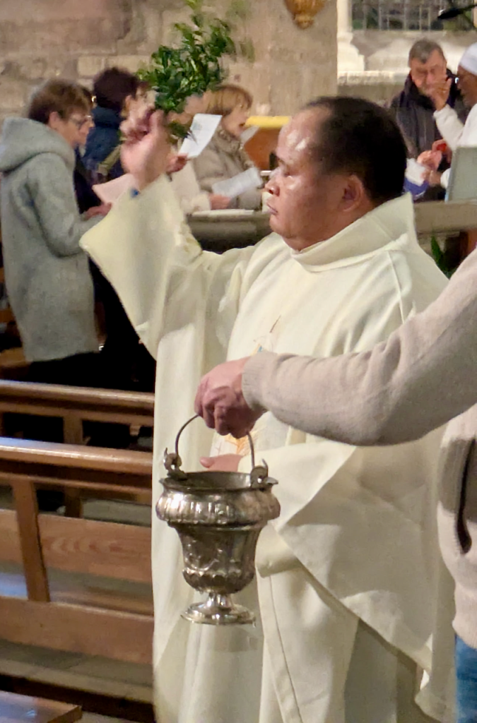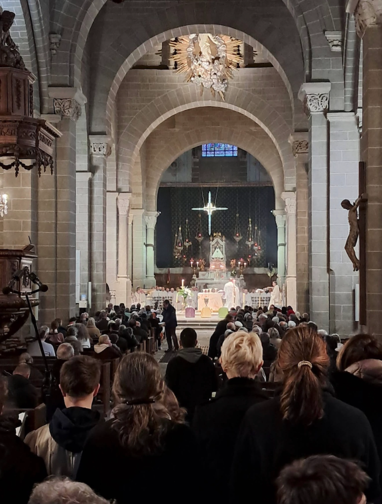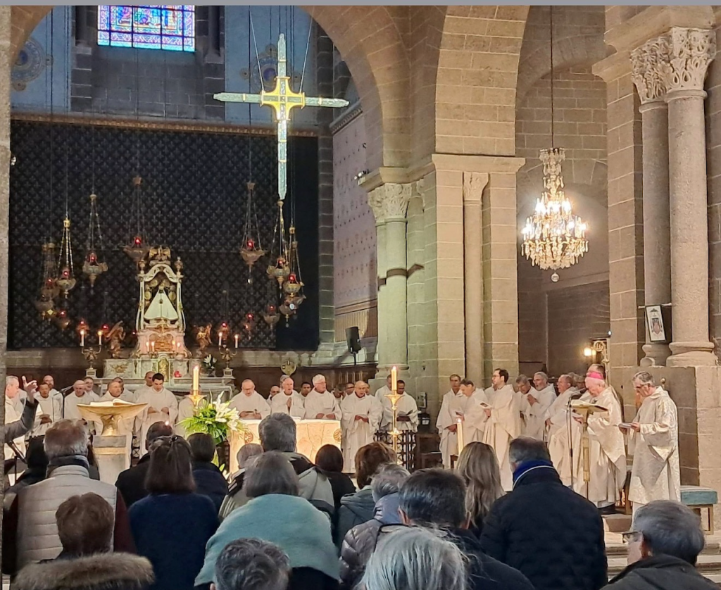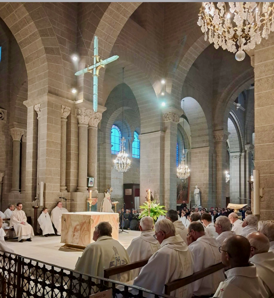 Après la fête des Rameaux, la semaine Sainte a commencé par la messe chrismale à la cathédrale du Puy-en-Velay qui a réuni l'ensemble des prêtres de notre diocèse, le presbiterium, autour de notre évêque. Là furent consacrées les Saintes Huiles qui vont servir tout au long de l'année.