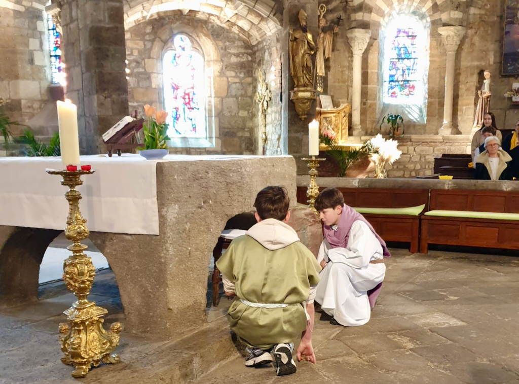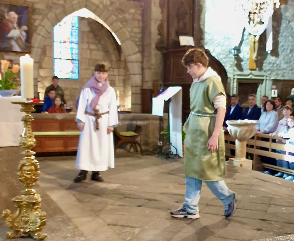 Les jeunes de l'aumônerie Grain de soleil ont mimé l'évangile et l'arrivée au tombeau des apôtres Jean et Pierre.