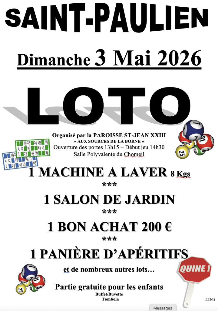 Loto de l’ensemble paroissial St Jean XXIII 3 Mai 2026 Salle du Chomeil