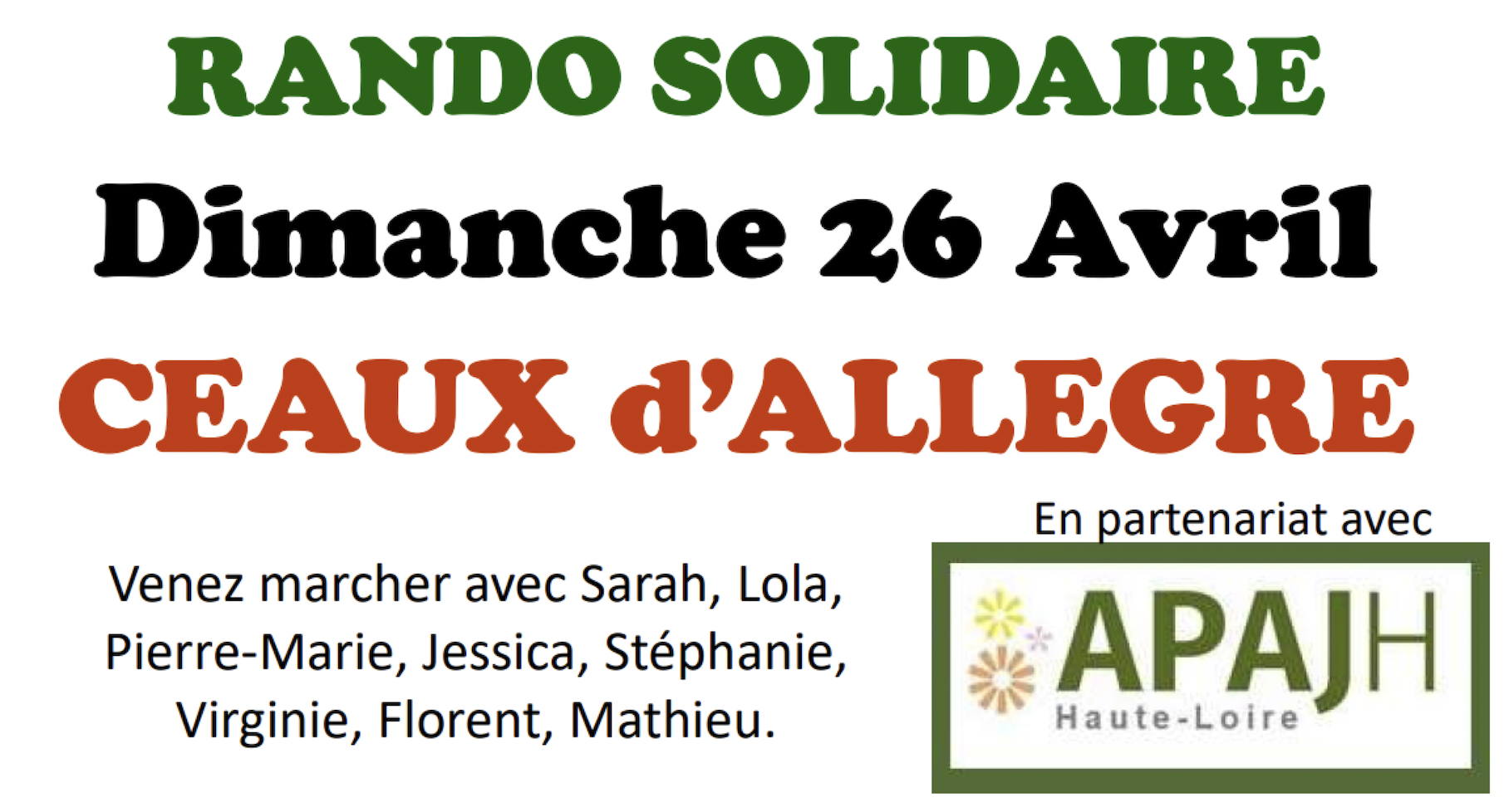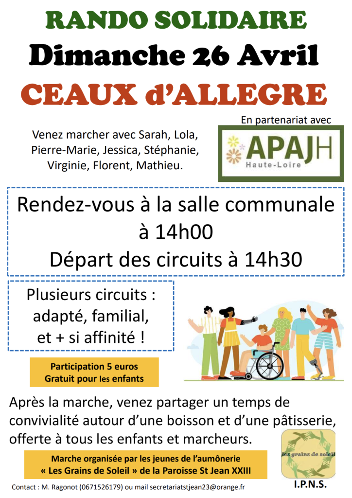 Les Grains de Soleil vous invitent à participer à leur marche solidaire qui aura lieu à Céaux‑d’Allègre, le dimanche 26 avril. Deux parcours vous seront proposés, d’environ 4 km et 8 km, accessibles à tous.